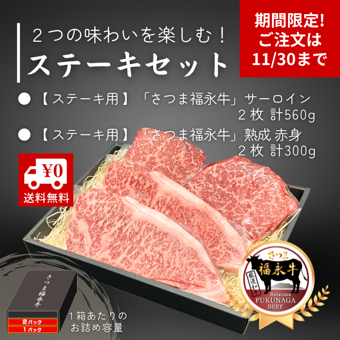 ステーキセット (サーロインステーキ2枚560g・熟成赤身ステーキ2枚300g) ***鹿児島県産黒毛和牛 さつま福永牛***